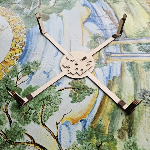 Cette création de 2024 est une horloge en marqueterie et vitraux rétro-éclairés ; à l'origine, un sous-verre avec des carrés de couleurs remplis de résine, et je me suis demandé ce qu'on pouvait améliorer pour en faire un cadeau digne de ce nom ; c'est comme ça qu'est venue l'idée de l'agrandir et d'y ajouter un mécanisme pour en faire une horloge, et surtout, de remplacer les carrés de couleur par des vitraux rétro-éclairés (avec un interrupteur magnétique invisible pour allumer l'éclairage)...