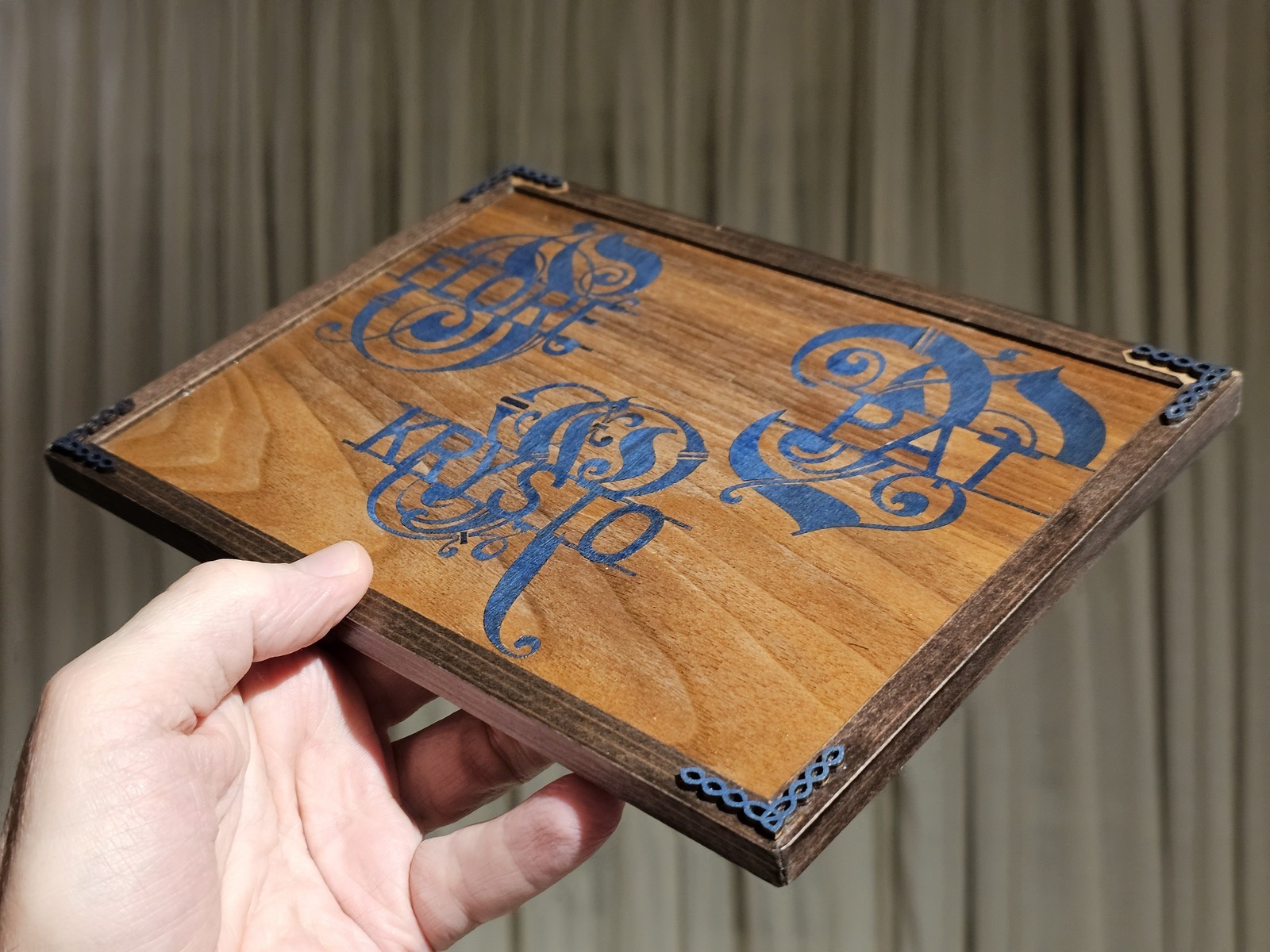 Vérification des effets visuels : selon l'angle, le tulipier capte plus ou moins la lumière (d'ailleurs on voit bien ici le "défaut" sur l'ovale au dessus du R de Krysto, et en dessous du S une petite pièce que j'ai dû refaire, plus sombres que le reste)