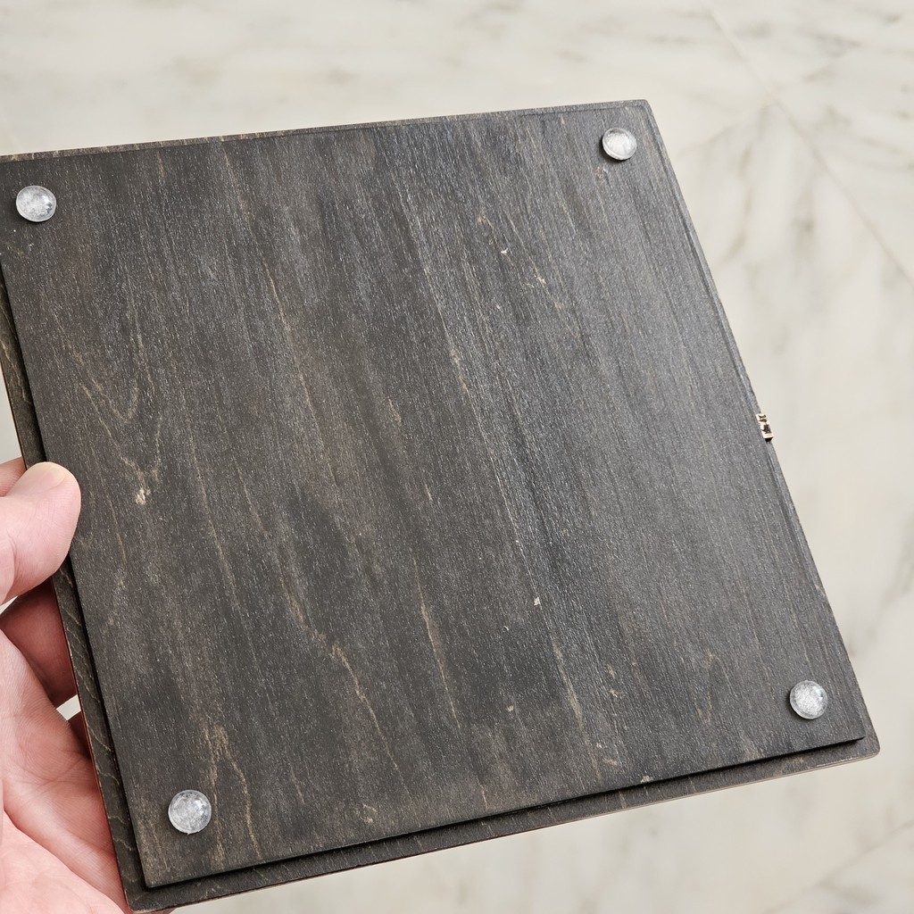 Le dessous du plateau, dans lequel est intégrée la plaque d'acier, et la signature du chat noir à droite :)
