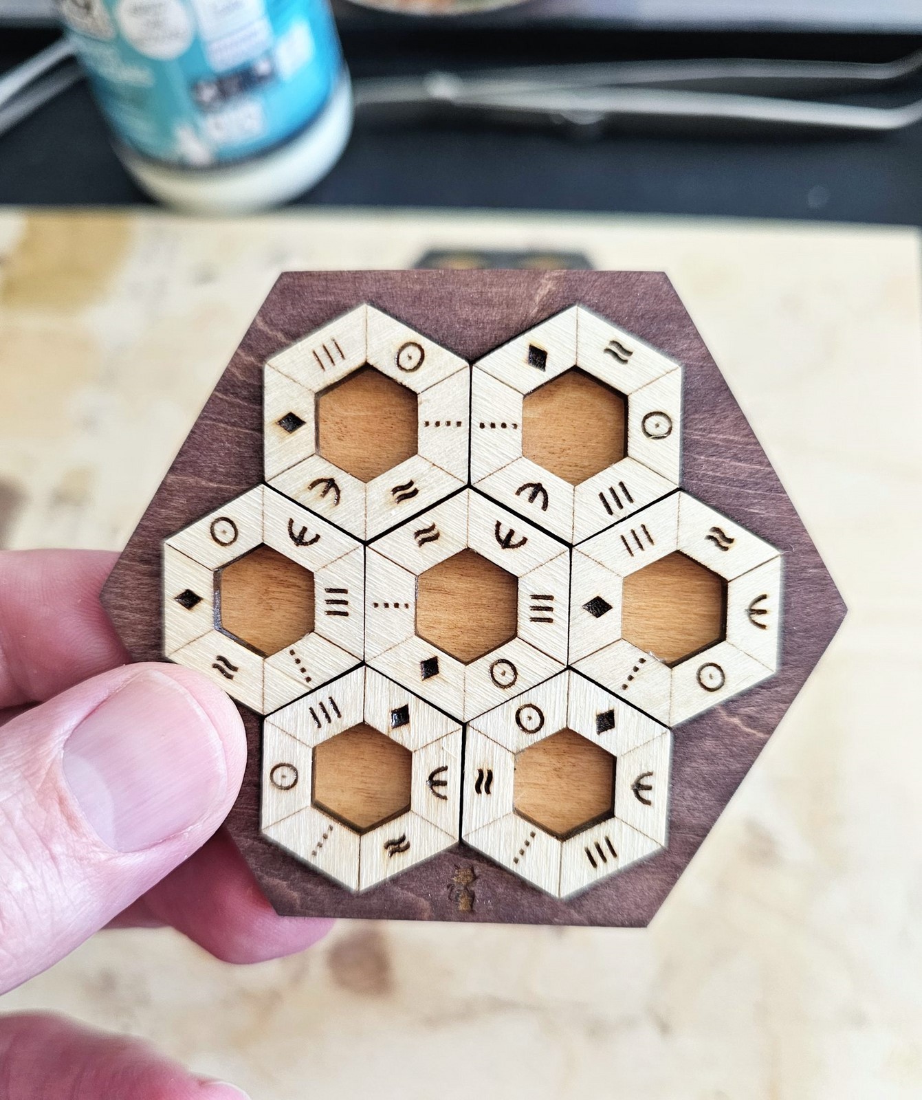 Il s'agit de placer les 7 pièces de sorte que toutes les faces en contact montrent un même symbole
