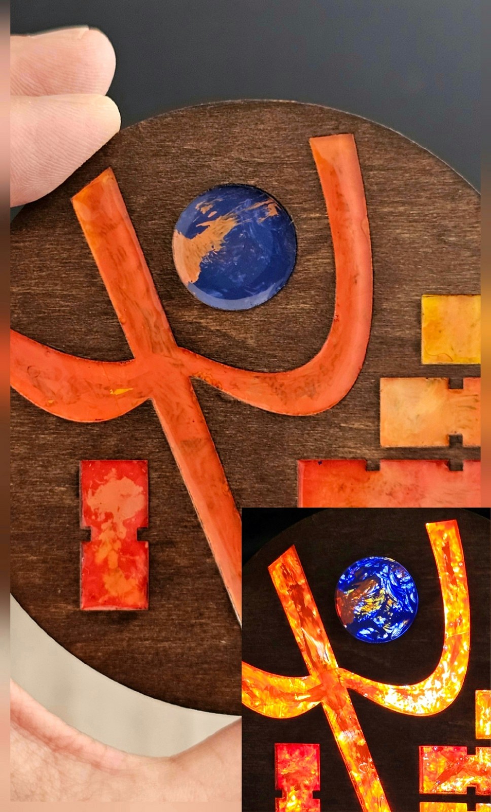 Ici je voulais travailler les couleurs, avec deux propositions coïncidentes : la vue "normale", par dessus, ce qui est visible au monde, l'interface aux autres en quelque sorte, et puis une vision plus intime en éclairant l'objet depuis l'arrière, et qui révèle alors les coups de pinceau, l'historique, les fractures, les éléments invisibles autrement, parfois chaotiques, parfois puissants, qui constituent l'ensemble ; je vois cette réunion comme une métaphore de la construction individuelle...
