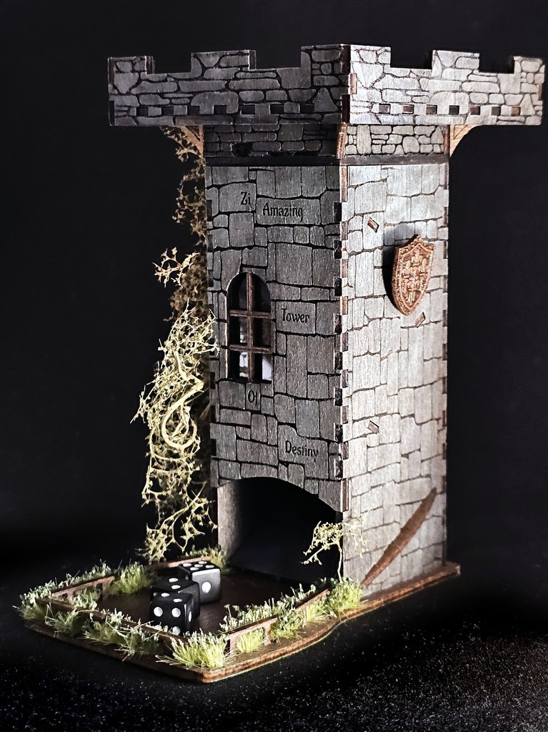 Il y avait longtemps que je voulais réaliser une tour de lancer de dés à l'image de celles qu'on voit dans le commerce ; elle est en bois de tilleul teinté et peint, adaptée aux dés de 5 à 10mm (ici des dés de 8mm). Elle est composées de 3 parties, la tour elle-même avec sa fenêtre et son blason, surmontée d'un étage de stockage en pierres plus foncées (capacité de 8 dés de 8mm), et enfin la plate-forme de lancement au sommet. La réalisation aura nécessité une journée et demie : dessin, gravure & découpe, teinture, peinture, collage, vernis, et décoration finale... :)
