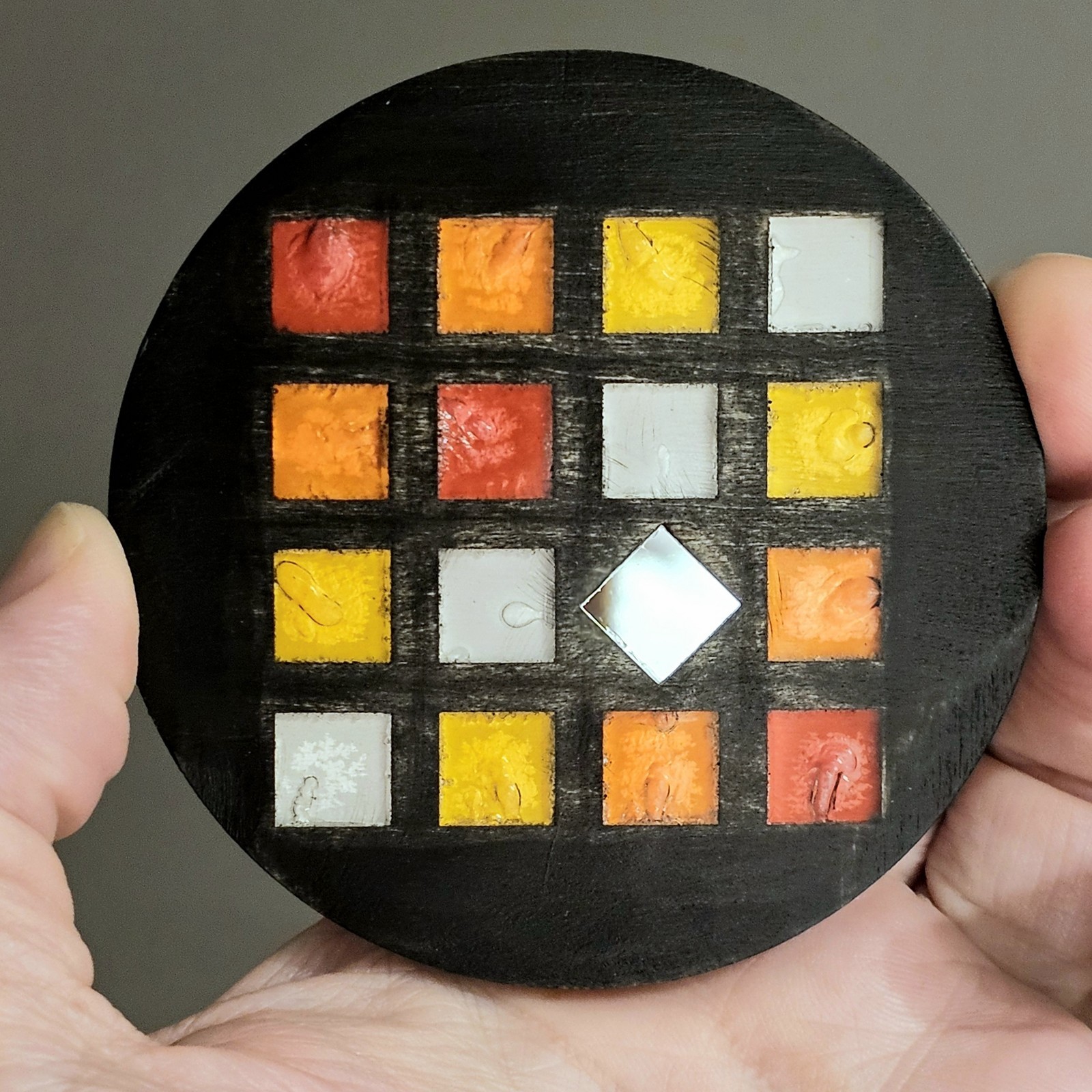 Le sous-verre qui a tout déclenché, 15 carrés de résine, fonds colorés, et un miroir